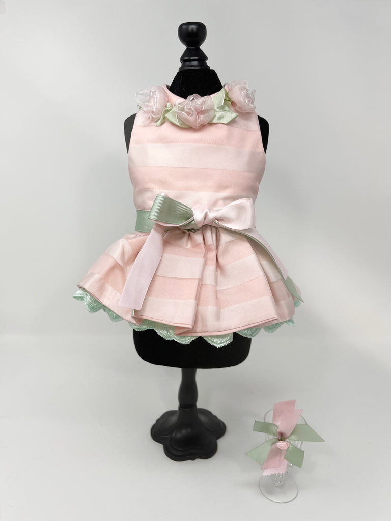 091 Classy Pink Satin Stripped Dress with Hair Bow Size XS