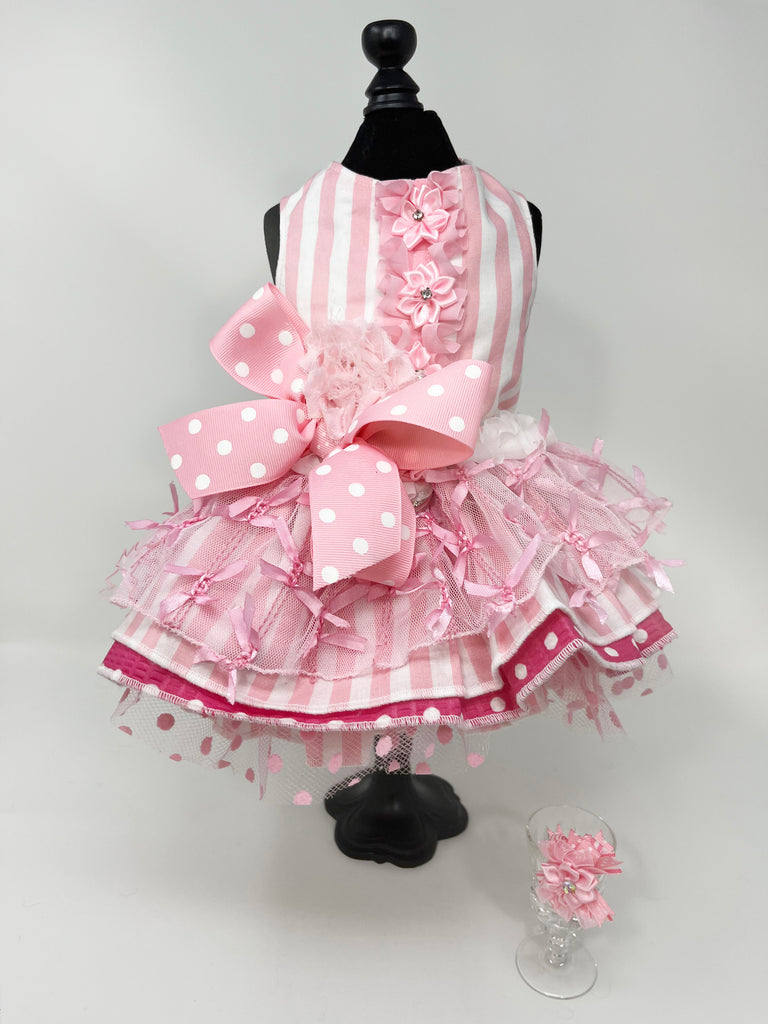 095 Pink Stripe & Polka Dot Dress with Large Ribbon Bow and Hair Bow Size M