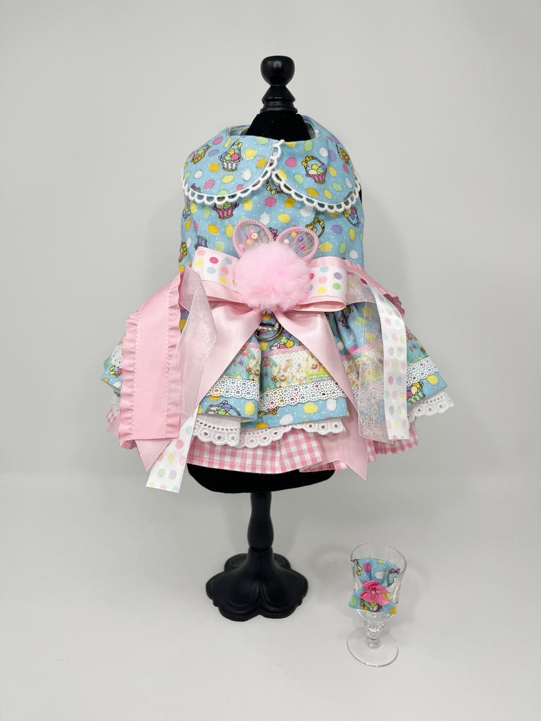 097 Easter Themed Blue & Pink Dress with Hair Bow Size S