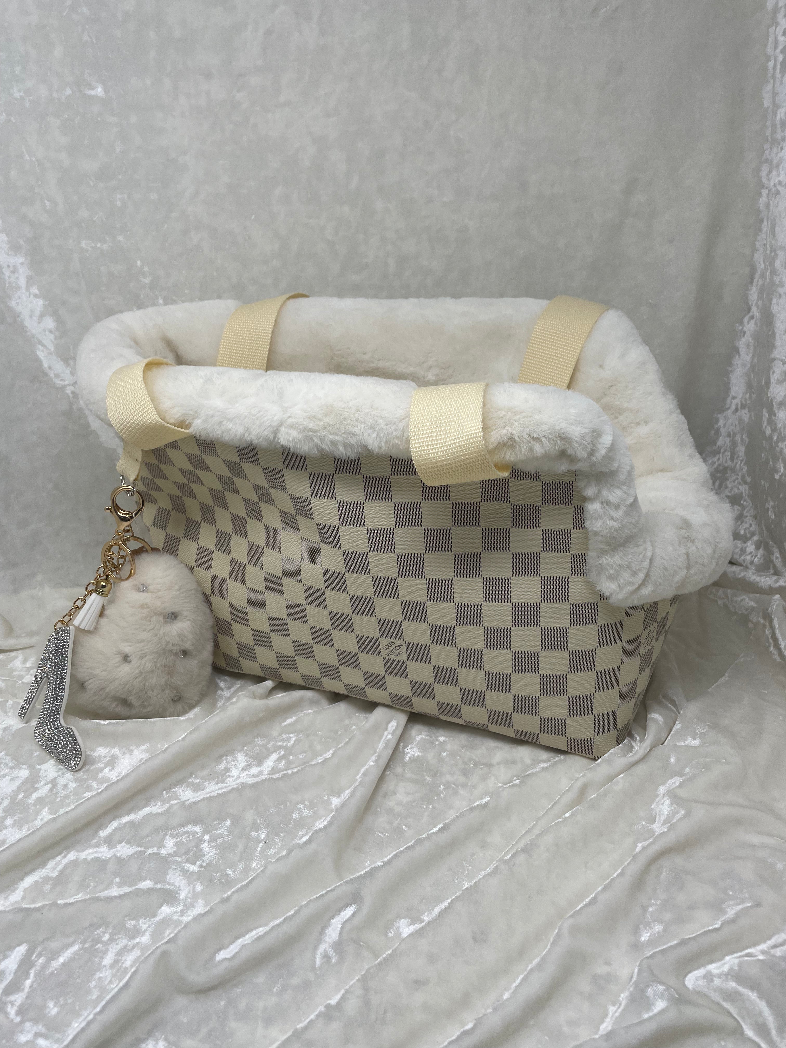 Handmade by Marian McElroy. Lined with faux fur with removable pad at the bottom and reinforced sides for comfort.