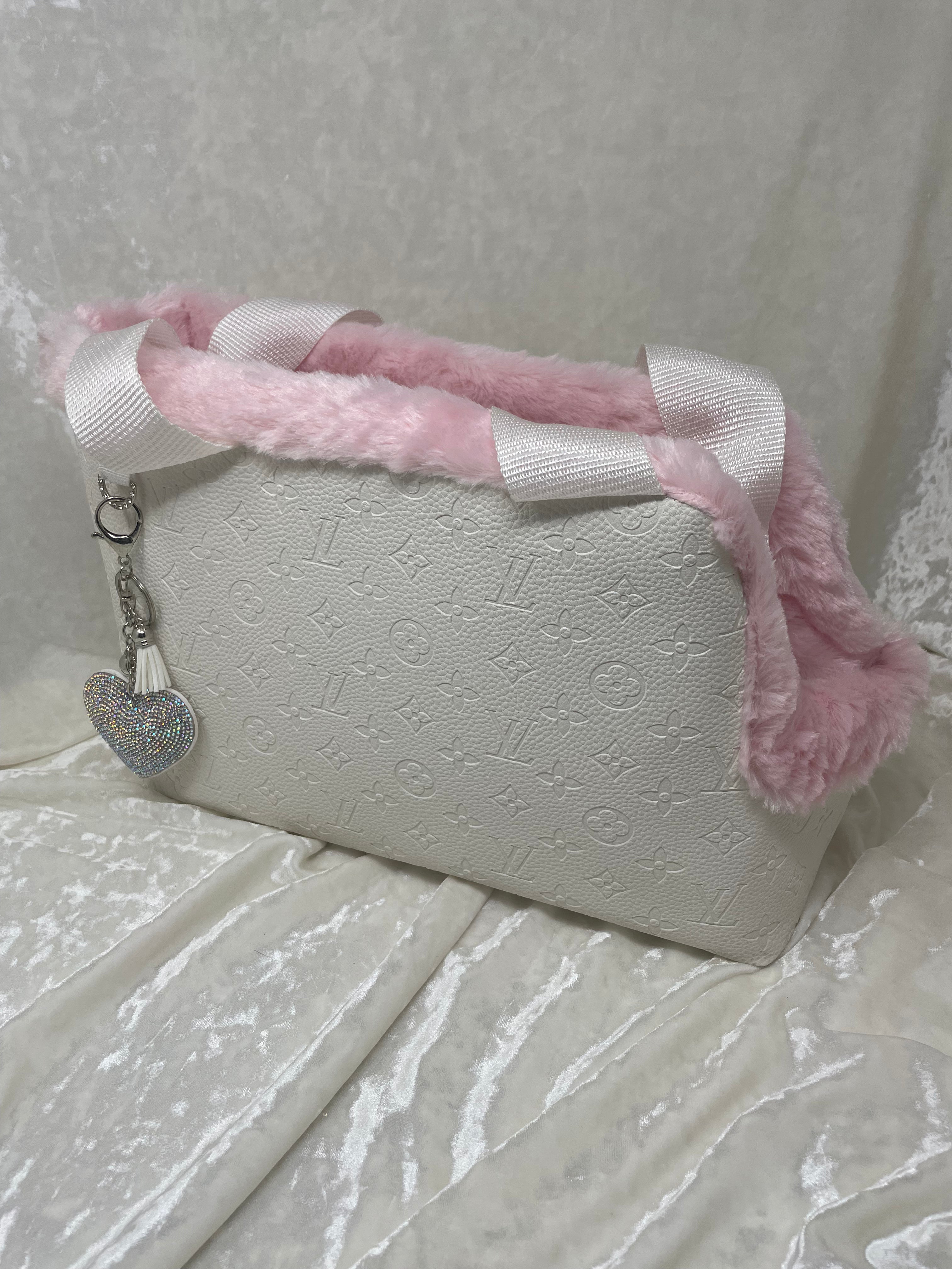 Handmade by Marian McElroy. Lined with faux fur with removable pad at the bottom and reinforced sides for comfort.